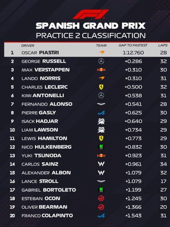 Franco Colapinto cerró el día en el último puesto, tras completar un giro en 1m14s303 con neumáticos blandos. El argentino había sufrido problemas hidráulicos en la FP1 y recién pudo girar con normalidad en la segunda tanda, aunque sin encontrar ritmo para salir del fondo de la tabla.