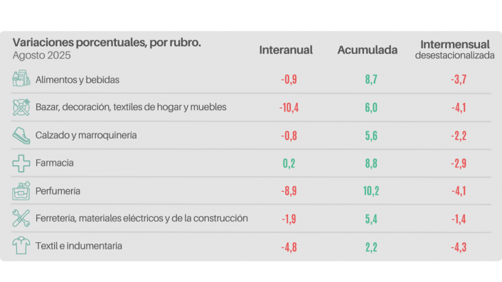Por rubros, la única variación positiva interanual se dio en Farmacia (0,2%). Los demás sectores mostraron bajas: Bazar, decoración, textiles para el hogar y muebles (-10,4%), Perfumería (-8,9%), Textil e indumentaria (-4,8%), Ferretería, materiales eléctricos y de la construcción (-1,9%), Alimentos y bebidas (-0,9%) y Calzado y marroquinería (-0,8%).