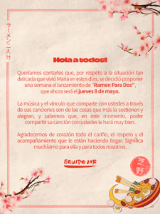 En palabras del entorno de la artista: “Queríamos contarles que, por respeto a la situación tan delicada que vivió María en estos días, se decidió posponer una semana el lanzamiento de ‘Ramen Para Dos’”. El comunicado subraya la importancia que tiene la música en la vida de la joven como una fuente de alivio emocional en momentos difíciles: “La música y el vínculo que comparte con ustedes a través de sus canciones son de las cosas que más la sostienen y alegran, y sabemos que, en este momento, poder compartir su canción con ustedes le hará muy bien”.