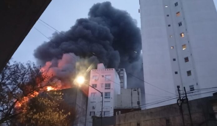 Personal de la guardia urbana confirmaron el peligro de derrumbe del edificio en llamas ¨Esta confirmado, se evacúa toda la manzana, y estamos sacando los vecinos a una cuadra de distancia¨.